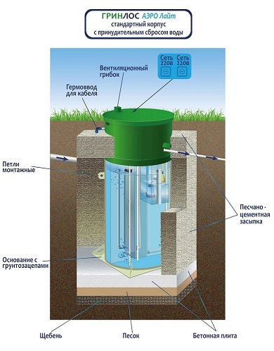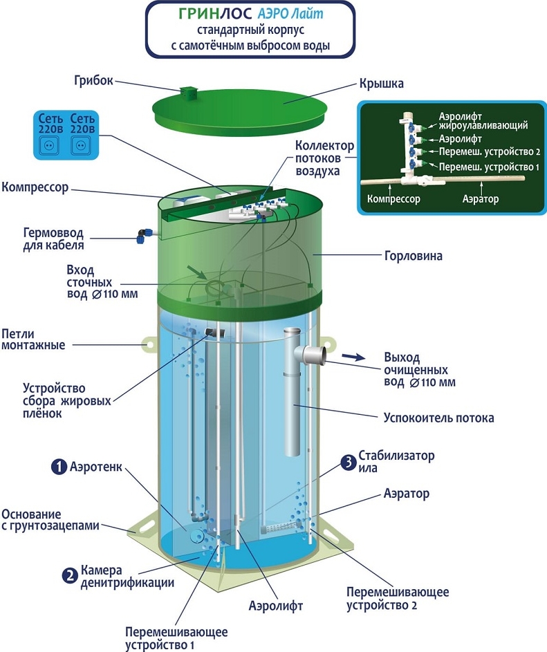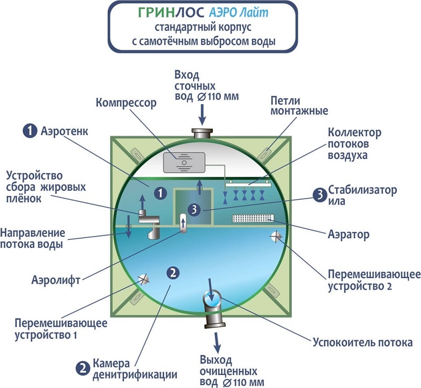 Станции Биологической Очистки Гринлос Аэро Лайт предназначены для расщепления и переработки основных органических загрязнений, содержащихся в бытовых сточных водах. Эти процессы происходят в результате жизнедеятельности аэробных и анаэробных микроорганизмов, условия для жизнедеятельности которых создает септик. Станция Гринлос Аэро Лайт сконструирована таким образом, что все камеры, в которых происходит аэрация, разделение и осветление стоков объединены в одном корпусе цилиндрической формы.